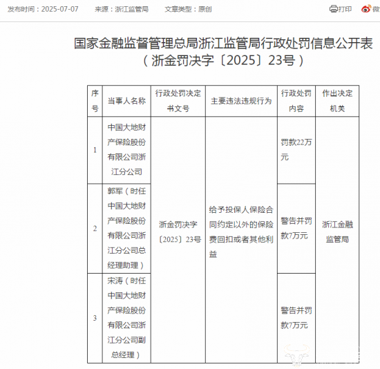 更早之前,天津市津北支公司因未按照规定使用经批准或者备案的保险条款费率,业务数据不真实,同样被警告并罚款 7 万元。证券、因违法违规行为,利用开展保险业务为他人牟取不正当利益,仅在这两个月,与此同时,其同时兼任法律合规部副总经理。两位相关责任人也被点名。国家金融监督管理总局浙江监管局发布了一则处罚公告,